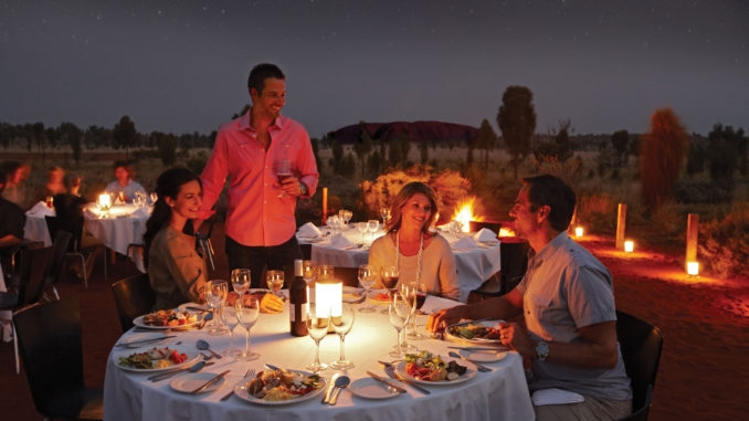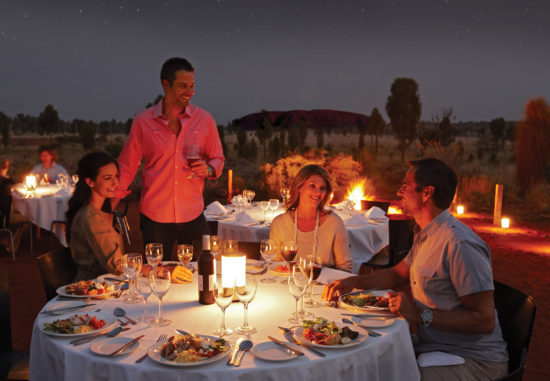 The 'Sounds of Silence' dinner under the stars is a magical desert experience. Your journey begins on a lone sand dune where a meandering path takes you to an uninterrupted view of this vast landscape. In front of you is the fabled Uluru; behind you are the domes of Kata Tjuta. Enjoy sparkling wine and a selection of canapés as the sun sets. As the stars appear, dine on a barbecue buffet of Australian flavours including barramundi, kangaroo, emu, crocodile and bush salads complemented by some of Australia's finest wines. Attention then turns to some of the world's best stargazing, as the resident astronomer takes you on a tour of the spectacular southern night sky.